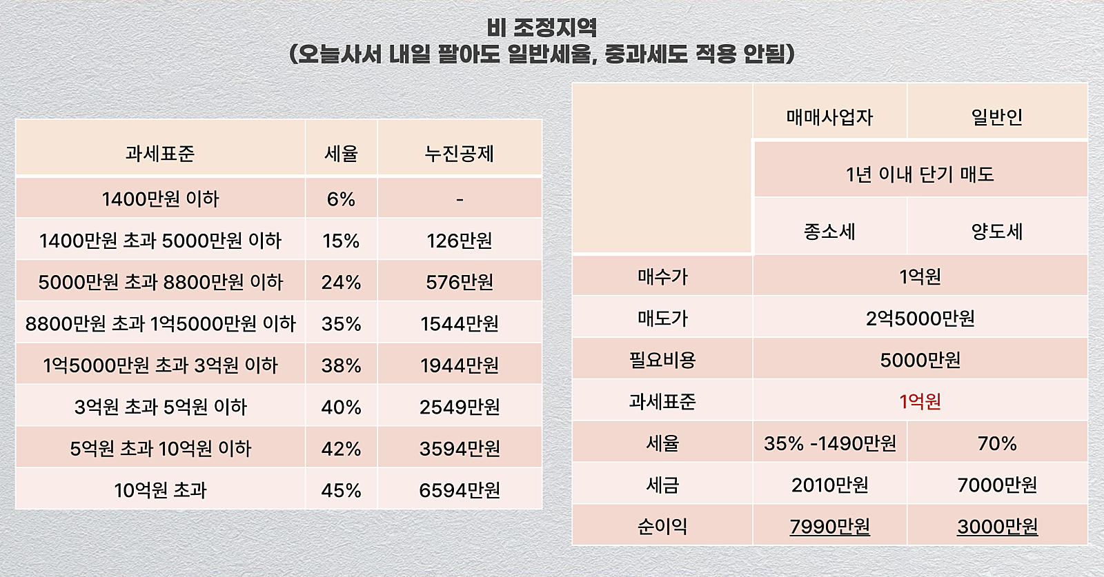 - 비교과세 대상: 주택 분양관(조정, 비조정), 비사업용 토지, 미등기 양도자산, 양도세 중과주택