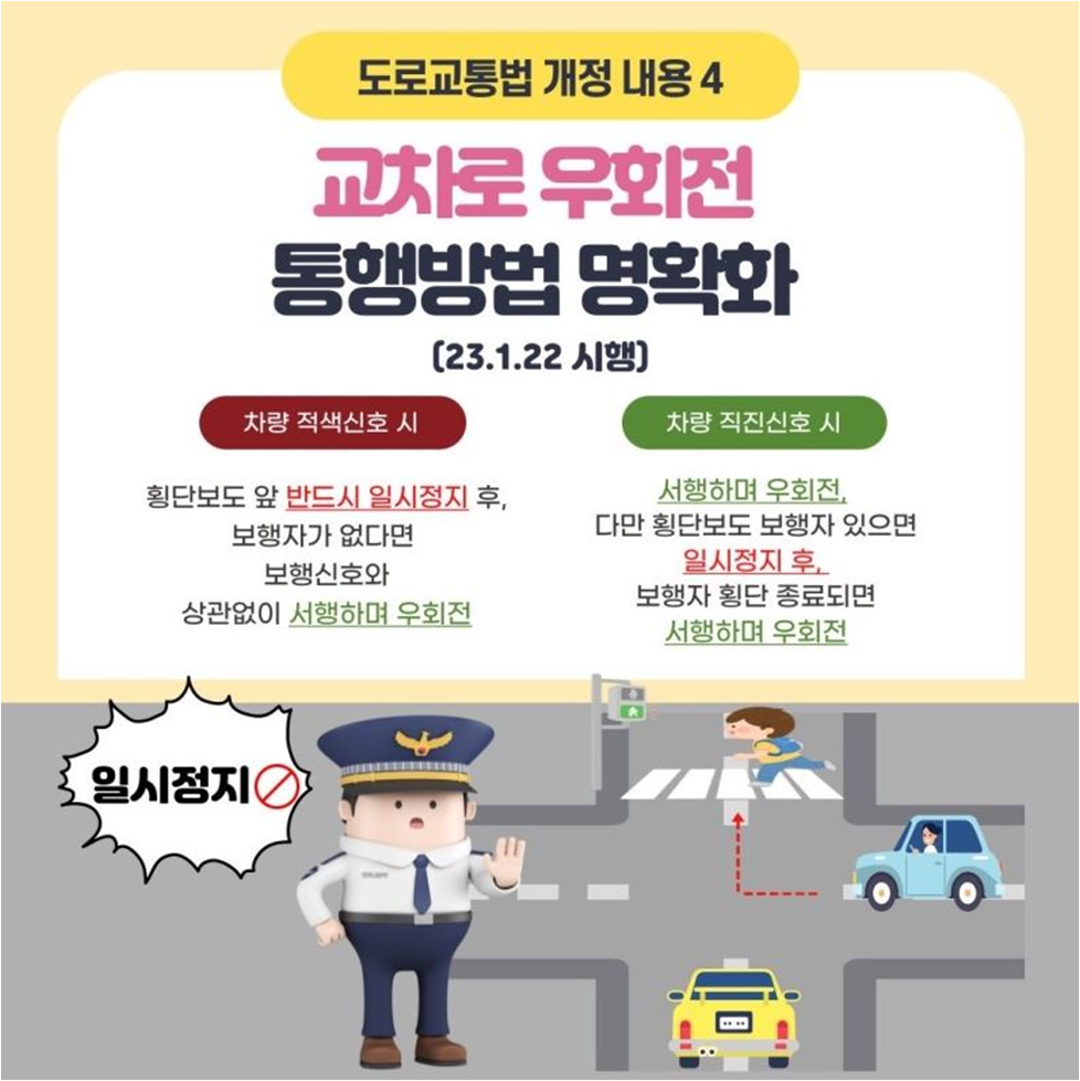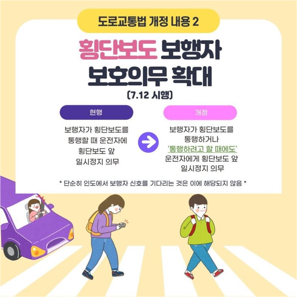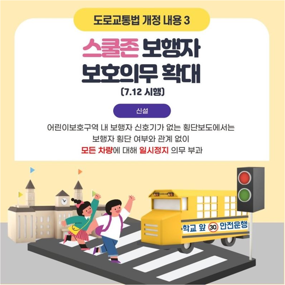1. 어린이 보호구역 내 횡단보도 중 신호기기가 설치되지 않은 횡단보도 앞에서도 보행자의 횡단 여부와 관계 없이 일시정지 의무 부여(벌점 10점/ 범칙금 6만원 , 승용차 기준)