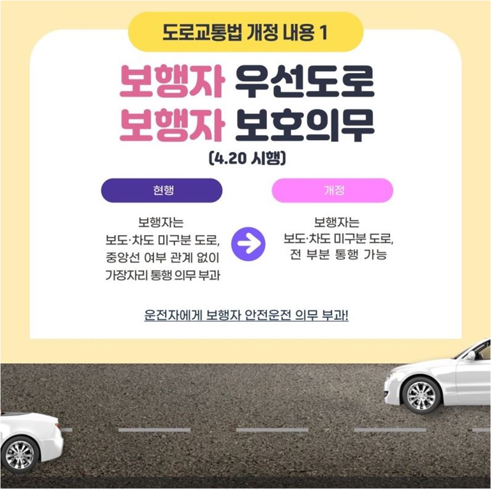 2. 보행자 우선도로에서는 차마의 속도를 20km/h 이내로 제한할 수 있고, 운전자에게는 서행, 일시정지 의무 부여 (벌점 10점/ 범칙금 4만원, 승용차 기준)
